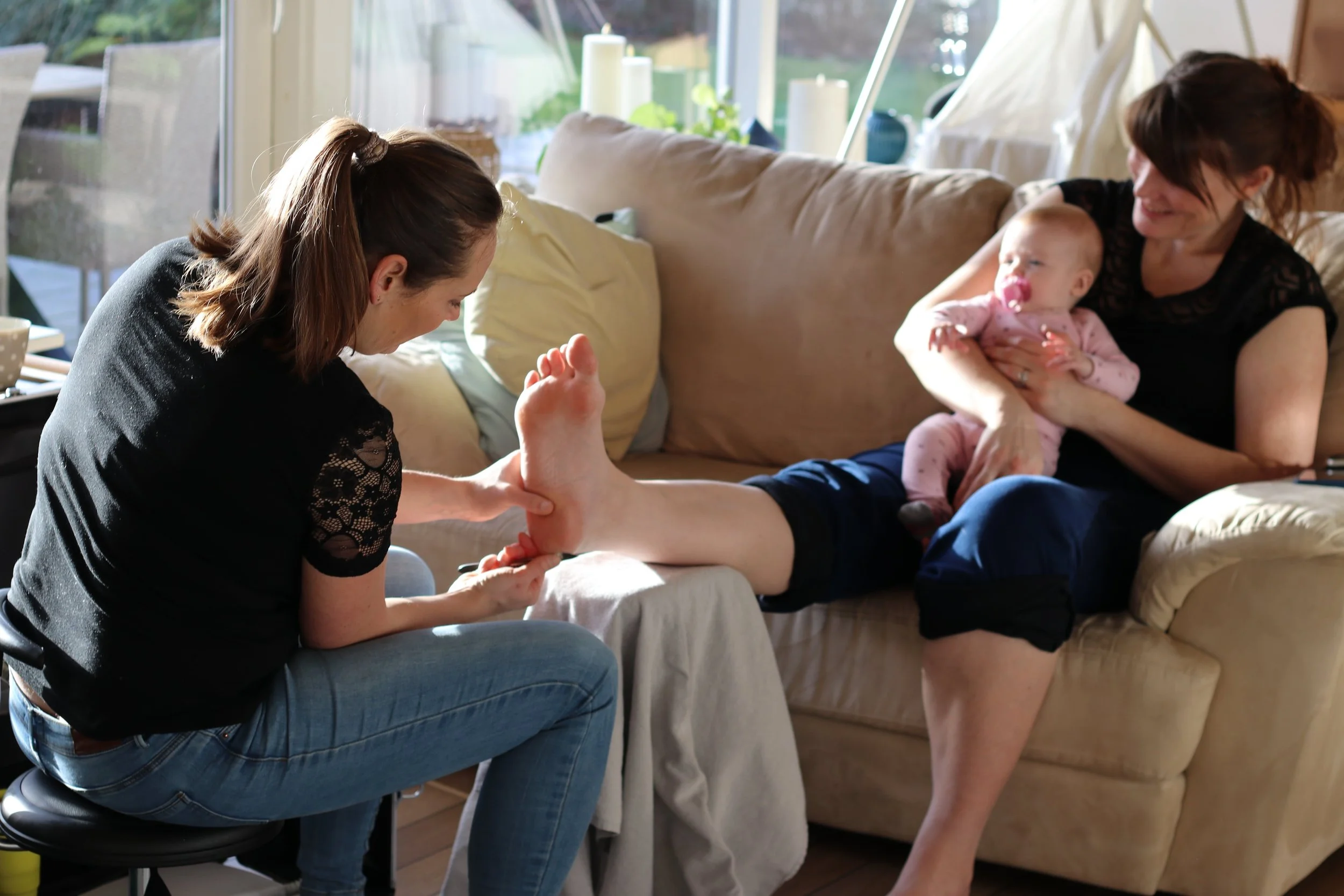 I behøver ikke tage nogen steder hen – jeg medbringer briks, olie, udstyr til fodterapi, cupper mm., så I kan slappe af i jeres egne rammer sammen med jeres babyer.