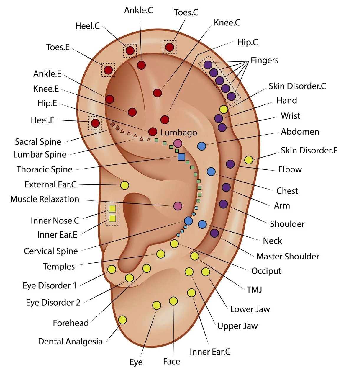 Øreakupunktur er et mikrosystem, hvor hele kroppen er repræsenteret i øret på specifikke punkter. Ubalancer behandles ved at stimulere det punkt på øret, der svarer til den kropsdel, hvor der er problemer.